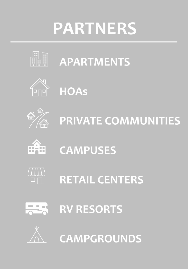 | Apartments | RV Resorts | Campuses | Private Communities | HOAs | All-Inclusive Amenities Solution | Retail Centers